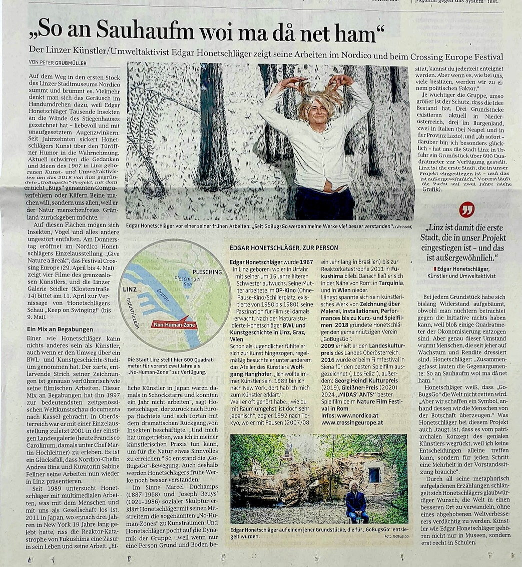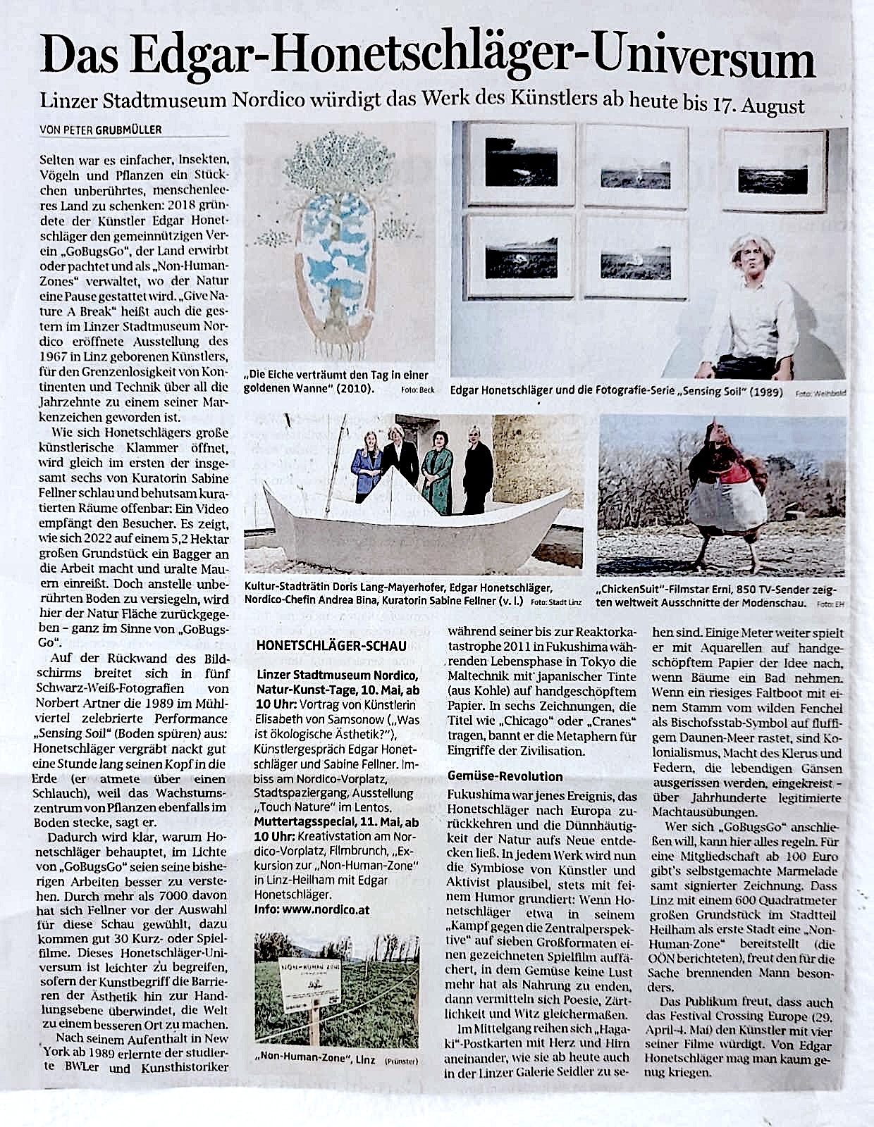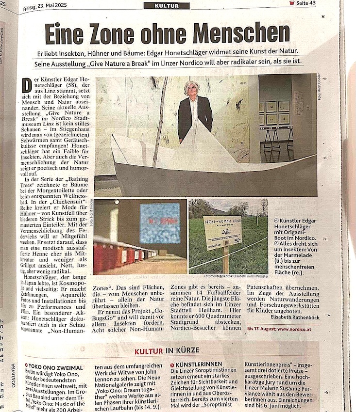 In 2018, as a response to the catastrophic impact of the Anthropocene, Honetschläger founded GoBugsGo – Set Nature Free, a non-profit organisation (NGO), thereby developing a groundbreaking, all-encompassing approach that combines art with environmental activism. This international project initiates collective renaturalisation measures designed to help insects regain their habitats. As a utopian artistic vision, zones are created from which humankind is excluded. In addition to a hundred works, including large-format film backdrops, a “Non-Human Zone” – “a living sculpture of the 21st century” – is also a central element of the exhibition in Linz.