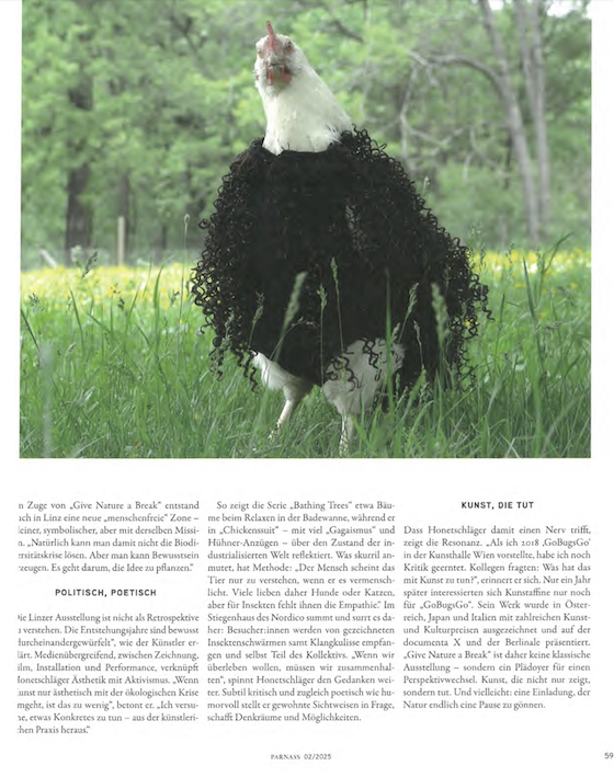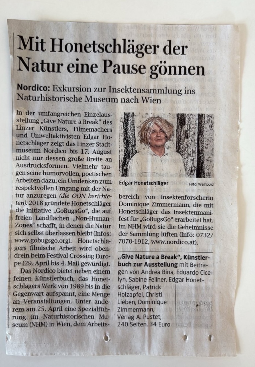 The artist’s book Give Nature a Break is published by Anton Pustet, Salzburg. Graphic Designer: Willi Schmid. Edited by Edgar Honetschläger with contributions by Andrea Bina, Eduardo Cicelyn, Sabine Fellner, Edgar Honetschläger, Patrick Holzapfel, Christl Lieben and Dominique Zimmermann. 240 pages, € 34