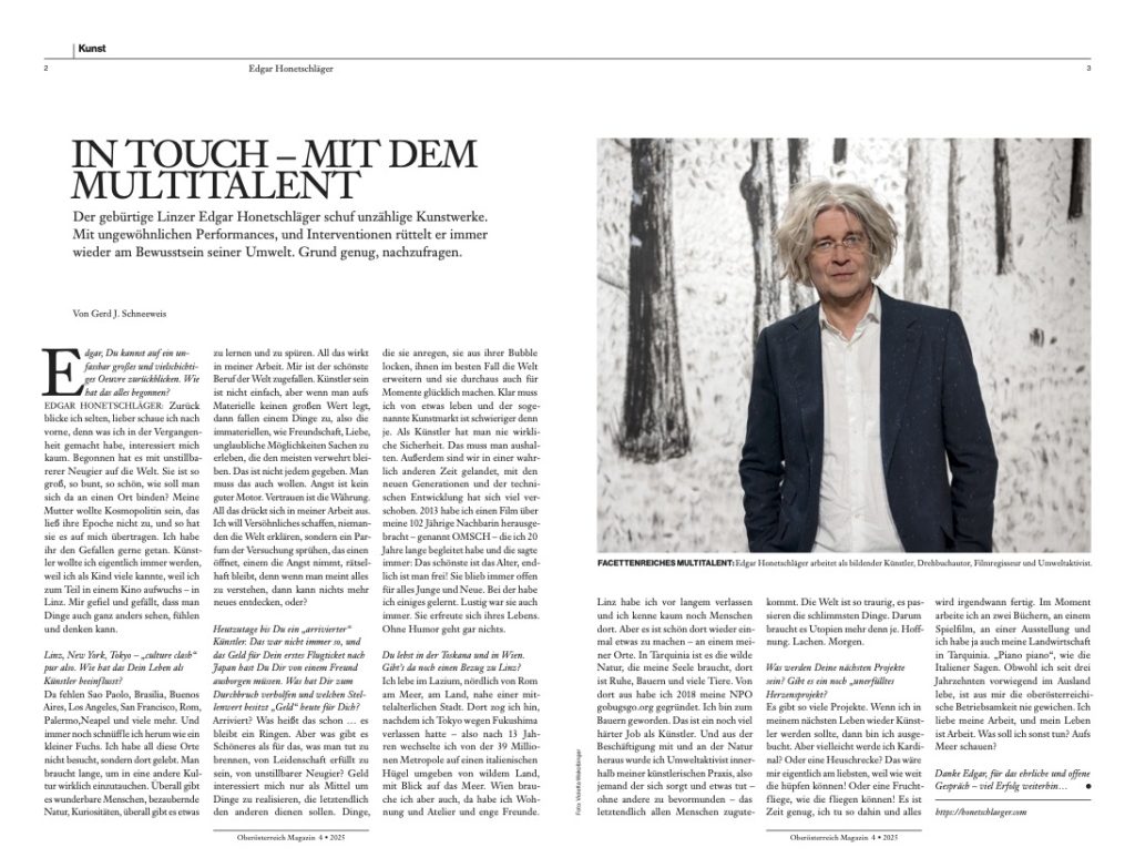Born in Linz, Honetschläger has been using multimedia to explore the dichotomy between man and nature since the 1980s. Subtly critical, while at the same time displaying a poetic and humorous quality, he uses surprising perspectives to question conventional perceptions. For Honetschläger, it simply is not enough for art to address the ongoing environmental crisis in terms of mere aesthetics. As an artist, he sees himself duty bound to take concrete action.
